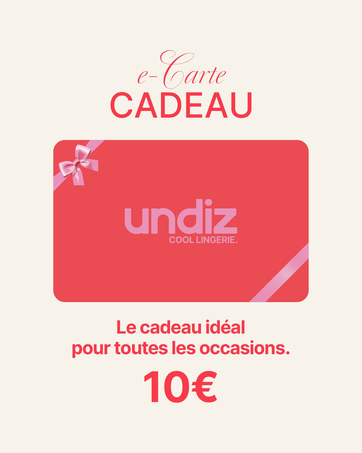 La e-carte Undiz de 10€ s’envoie par e-mail (sous 2h ou programmée), puis s’utilise en une ou plusieurs fois sur undiz.com et dans toutes les boutiques Undiz en France, pendant 12 mois à compter de l’envoi de l’e-mail.